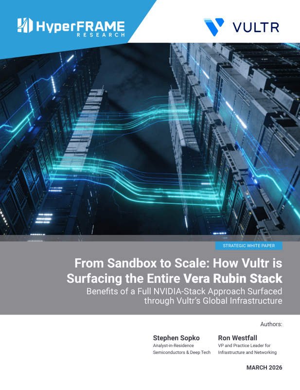 In From Sandbox to Scale: How Vultr is Surfacing the Entire Vera Rubin Stack, HyperFRAME Research analysts Stephen Sopko and Ron Westfall examine why the full NVIDIA software stack (Dynamo, Nemotron, NeMo, and the Inference Context Memory Storage Platform) matters as much as the hardware it runs on. The cloud partner an enterprise chooses to access Vera Rubin through may ultimately determine more of its production AI outcomes than the chip specifications will.